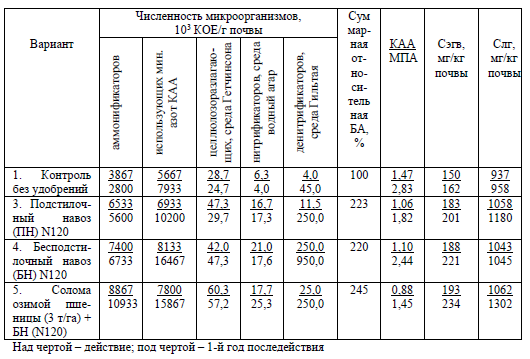 Результаты исследований говорят о том, что именно комбинация азотных удобрений и соломы наилучшим образом влияет на развитие почвенной микробиоты и тем самым повышает плодородие почвы.