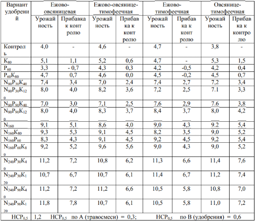 В опытах при среднем уровне минерального питания аммиачной селитрой (N160) овсянице-тимофеечной травосмеси прибавка к контролю достигала 5,3-5,4 т. на 1 га сухой массы, то есть в сравнении с контролем урожай увеличился почти в два с лишним раза. Изменение соотношения N:Р:К при подобном уровне удобрения было не эффективно. Внесение N240 (высокий уровень азотного питания) при соответствующем РК статистически достоверно увеличивает выход продукции по всем вариантам, причем изменение соотношения N:Р:К роли не играло. Урожай по всем травосмесям увеличился более чем в 2,5 раза [4].